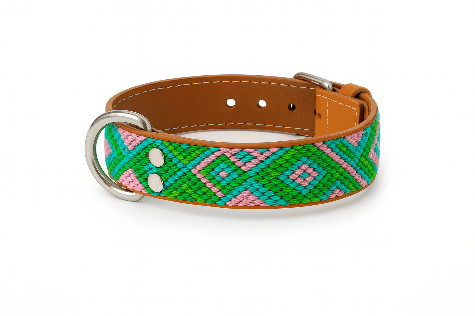 Ručně vyráběný psí obojek v barvách zelené a růžové*