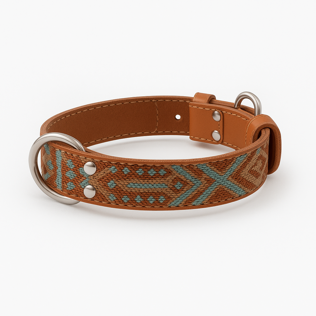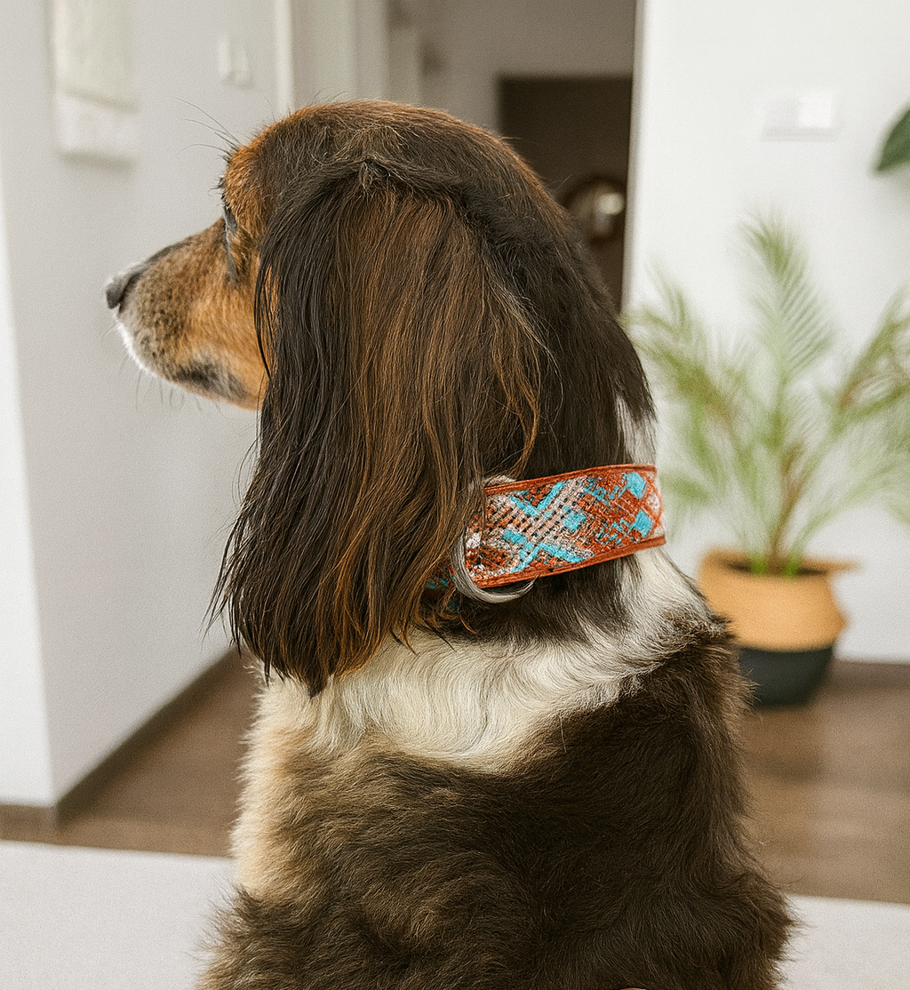 Ručně vyráběný psí obojek v barvách hnědé a tyrkysové*
