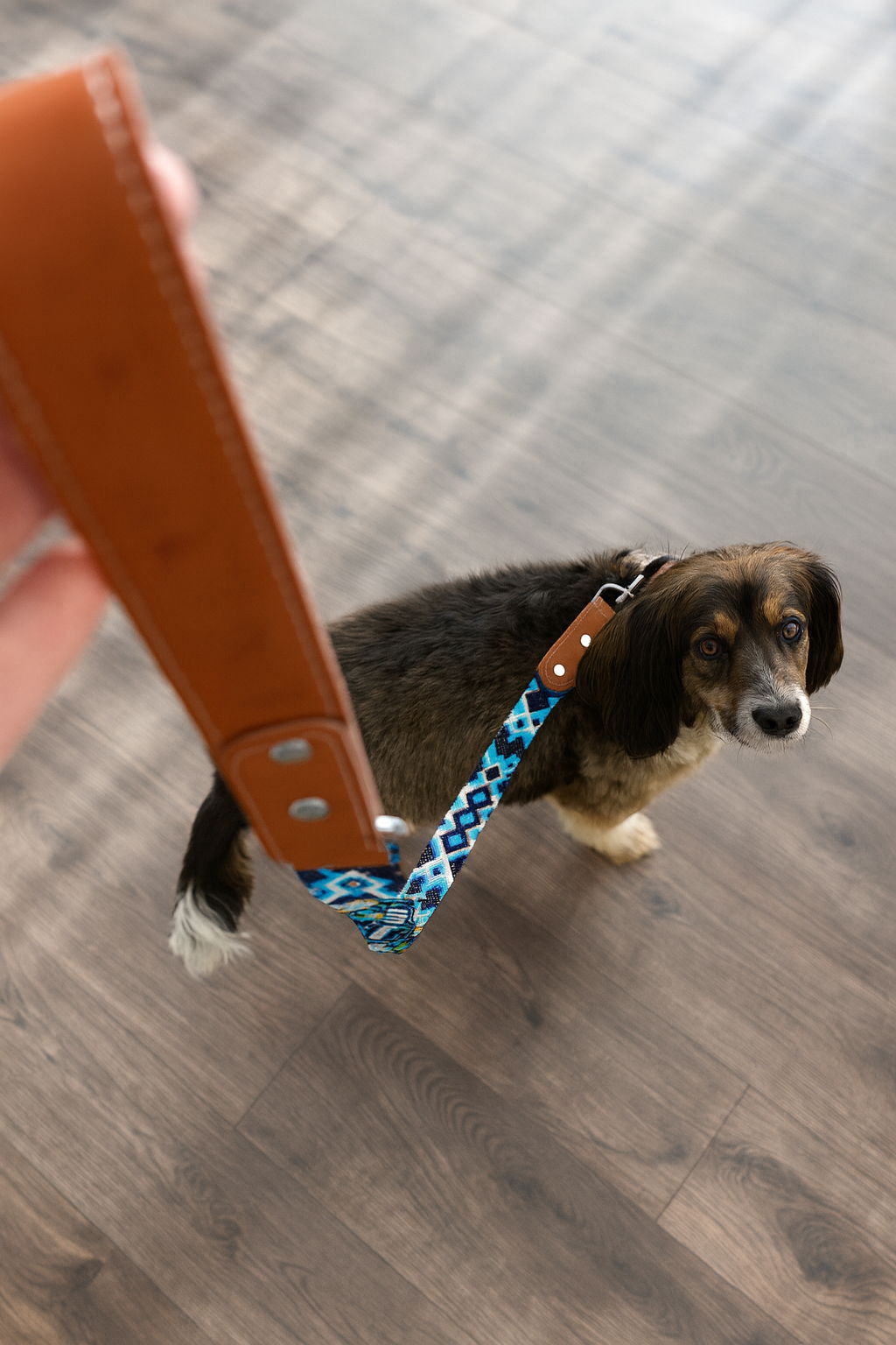 Vodítko pro psy vyrobené 100% ručně mexickými řemeslníky v barvách odstínů modré.