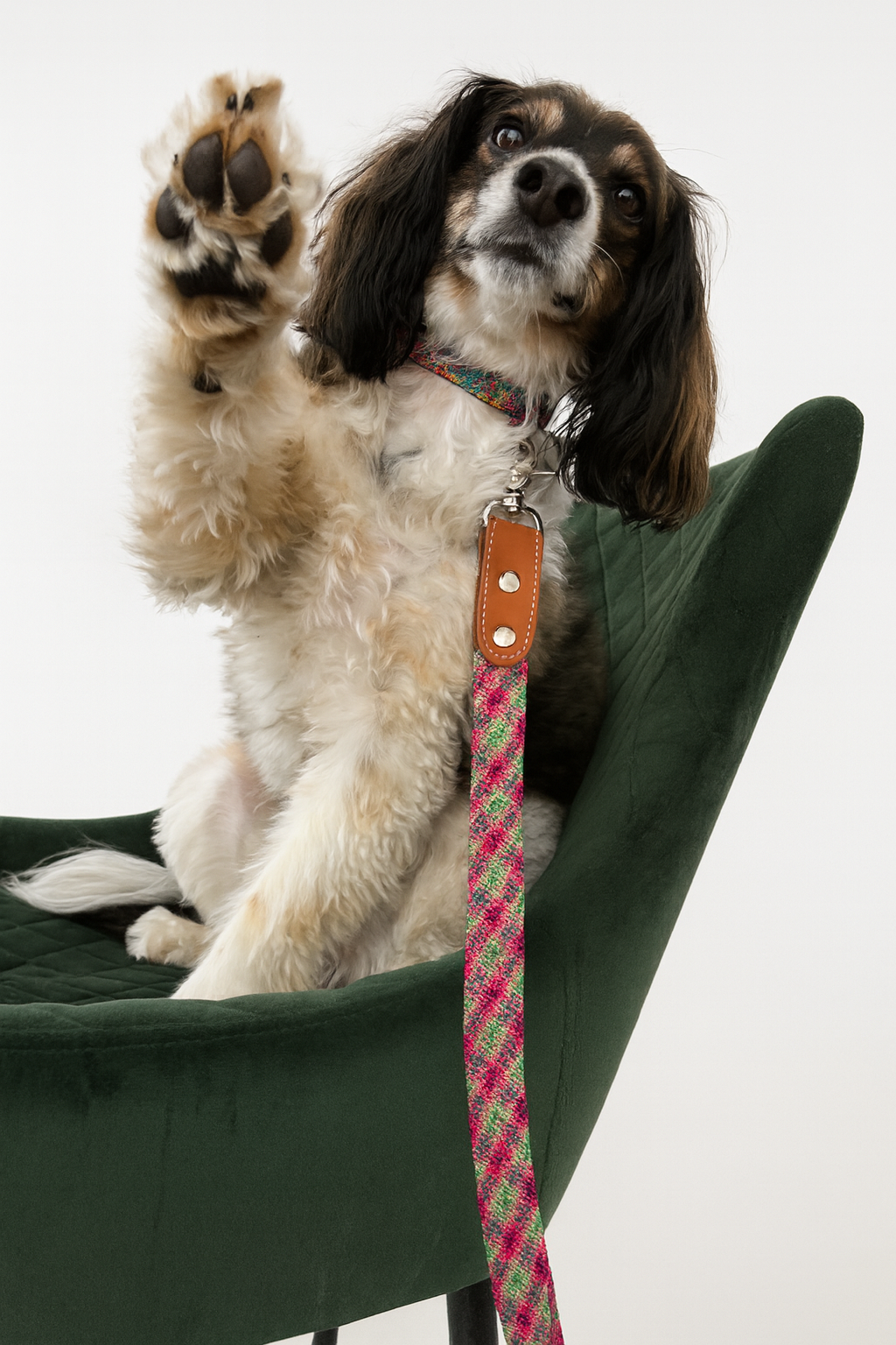 Vodítko pro psy vyrobené 100% ručně mexickými řemeslníky v barvách zelené a růžové.