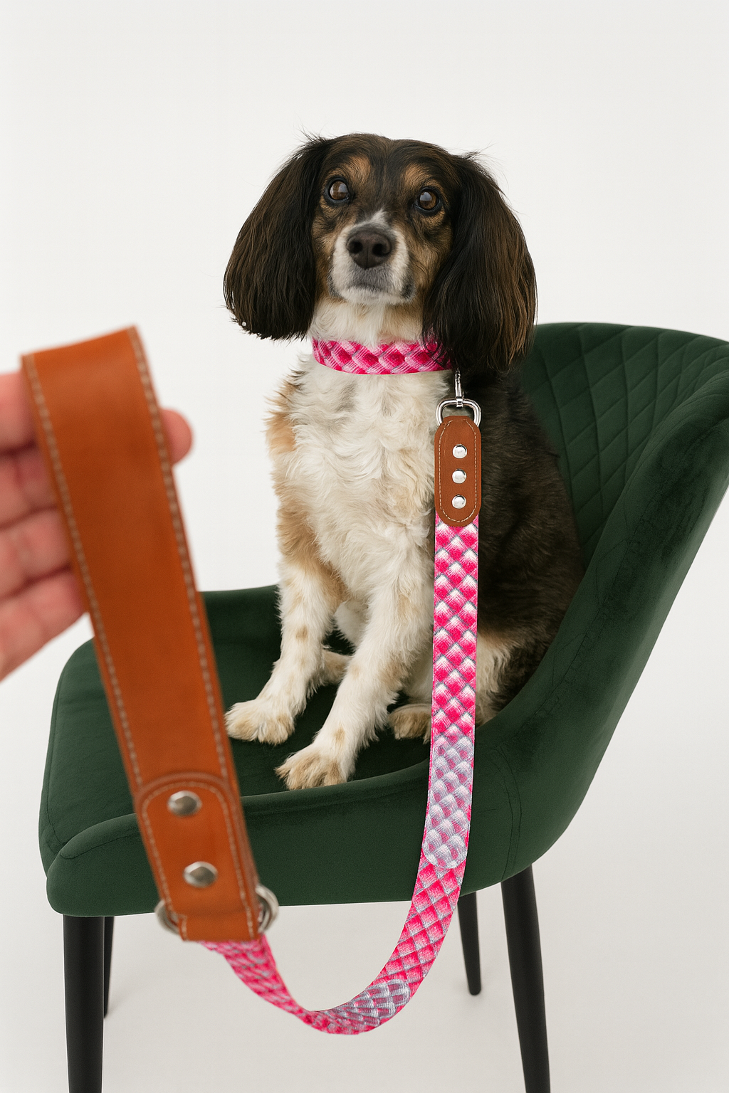 Vodítko pro psy vyrobené 100% ručně mexickými řemeslníky v barvách růžové a fialové.